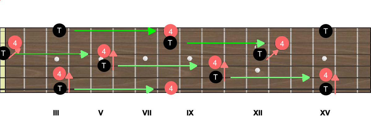 Também é interessante notar que se você ler o gráfico de baixo para cima você lê a ordem das quartas direitas e aqueles mais acostumados com a teoria de você saberão que a quinta perfeita e a quarta direita são intervalos complementares (caso contrário, diga se vamos procurar uma nota com um intervalo a subir, vamos encontrar esta mesma nota a descer com o seu intervalo complementar).